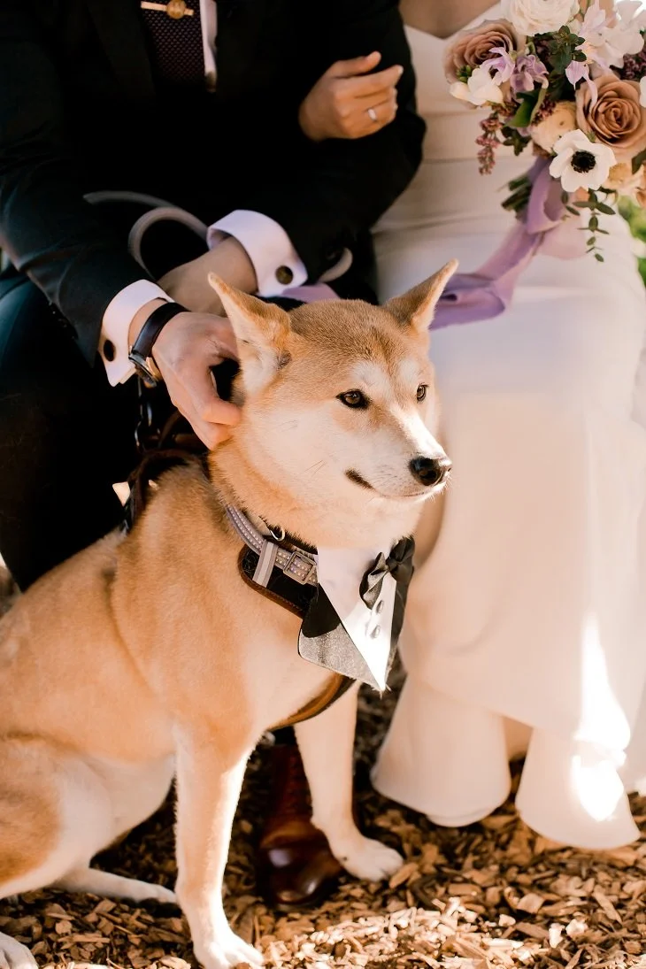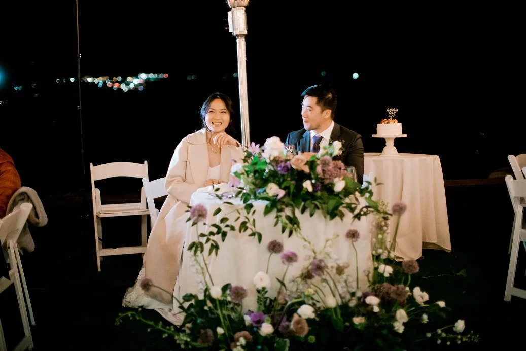 Both the Ceremony and Reception were outdoors and nights get cold in the Santa Cruz mountains! To help guests stay warm, we rented extra heaters and provided blankets as favors for each guest. During Cocktail Hour and throughout the Reception, guests enjoyed an open bar and boba bar. Fog rolled in during dinner time which made the dinner ambience absolutely dreamy. We served sweets from a local Japanese-French patisserie for dessert and the couple cut a simple cake decorated with adorable Shiba dog caketoppers!