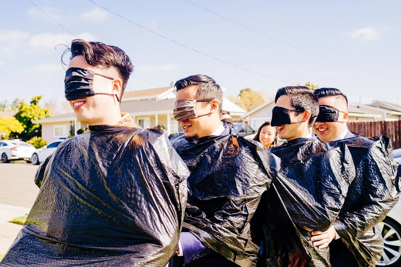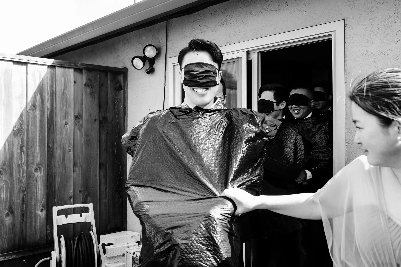 As is traditional Chinese Tea Ceremony customs, we started the morning at the Bride’s home with “Groom games”. Only after successful “hazing” of the Groom (and Groomsmen) could the Groom retrieve his Bride. The Bridesmaids prepared a series of fun games to challenge the guys, while family members of both sides observed. As soon as the men arrived, they were blindfolded with facemasks (creative, no??), put on trashbags, and were led to the backyard to play the games.