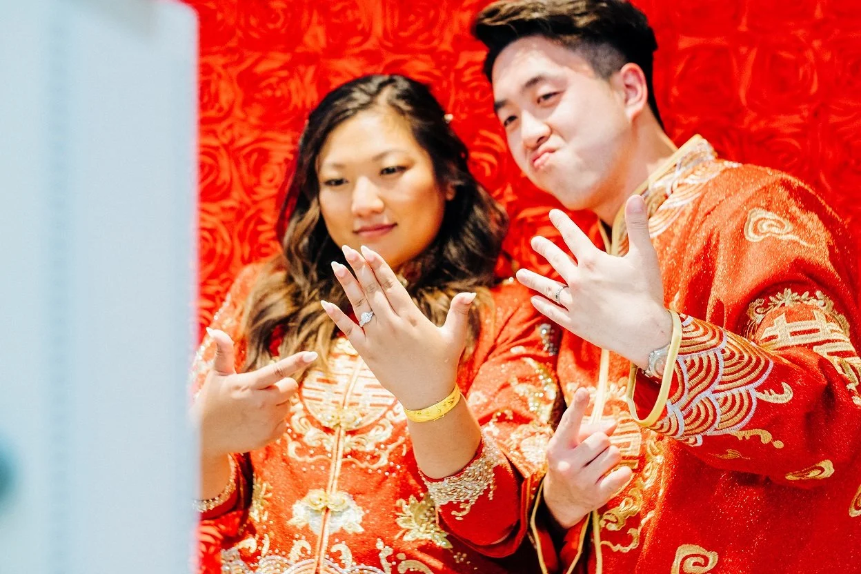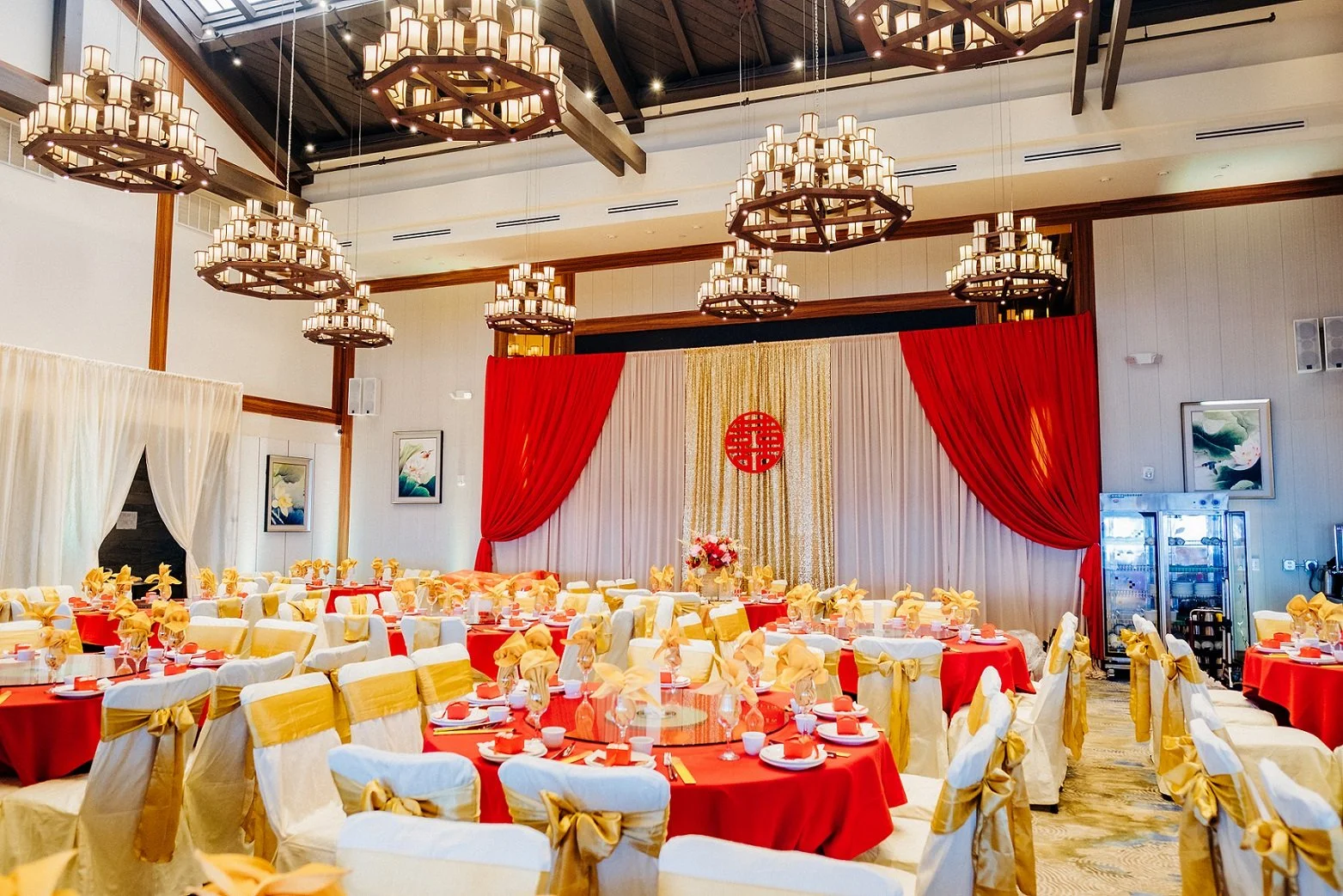 Everyone then traveled over to the Groom’s home for the Tea Ceremony. Both the Bride and Groom were dressed in Xiu He Fu (繡和服) traditional Chinese attire for the Chinese Tea Ceremony to formally honor their family members. We compiled a list of over 30 sets of parties to be honored. It was a beautiful thing to witness all the Aunties and Uncles actively preparing and participating in the whole Tea Ceremony. During this process, lunch was delivered and the Bridal Party enjoyed a brief break. After the Tea Ceremony and lunch, we headed over to the Chinese banquet hall to set up the reception space. We worked quickly alongside the decorator, banquet staff, and helpers to set up the room and completely transformed the space into a classic Chinese banquet reception!