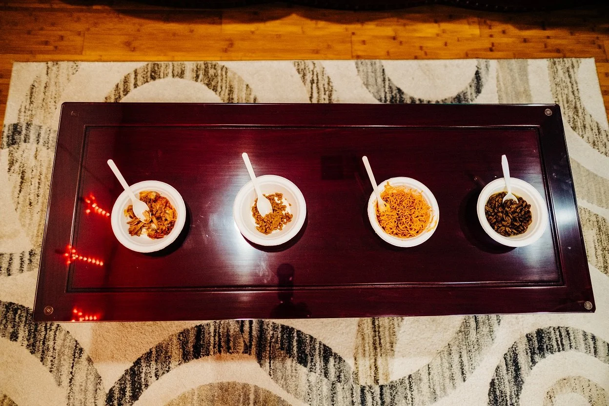 The first game tested the guys’ tastebuds as they were forced to eat very creative (and often gross!) snacks and guess what they ate. These snacks included Korean fiery noodles (buldak), silkworms (!!), and natto. The second game lined up the men to compete against one another in eating various treats attached on strings. Unfortunately, the poor Groom was boxed out at the last minute and had to eat a super crazy hot ghost pepper as punishment for being last to finish the race. Family members swiftly provided milk to abate the hot-pepper-sweats.