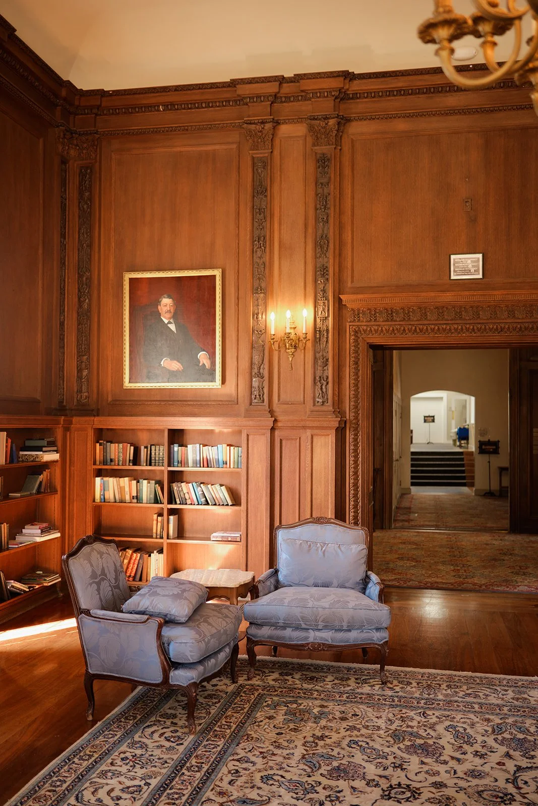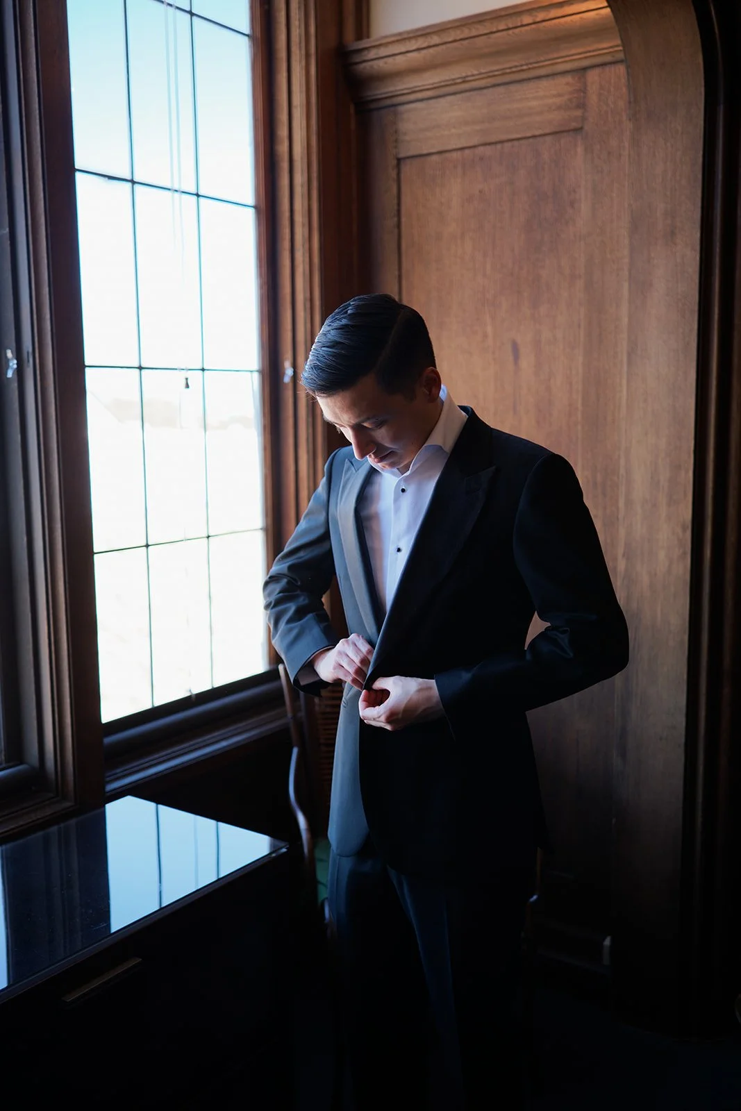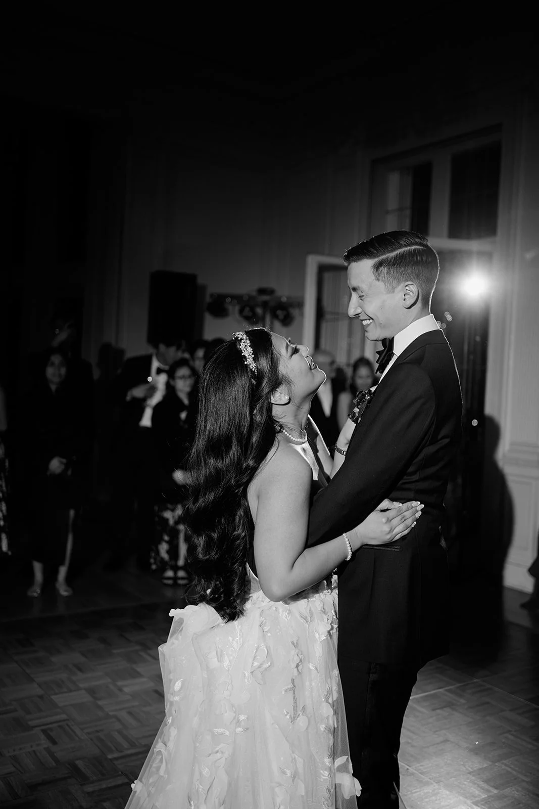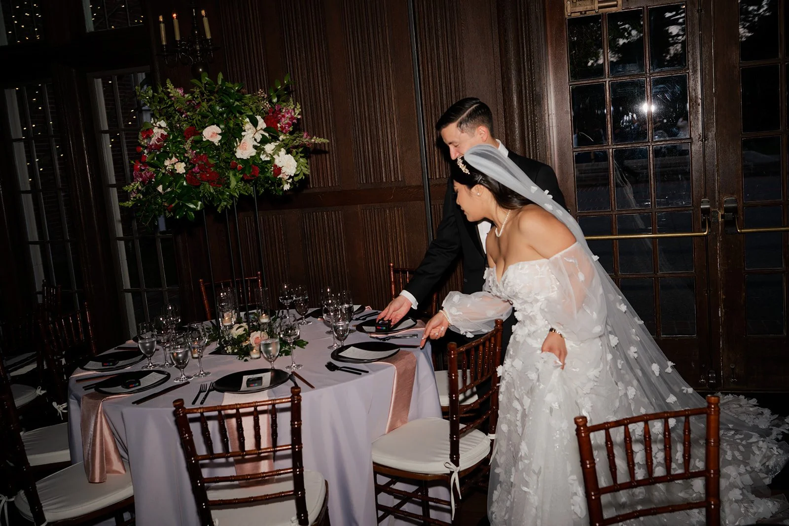 To design their moody-and-classy wedding, we leaned into the vibe of the grand mansion venue and focused on elevating all the strong contrasts and darker tones. Colors included black, maroon, peachy pink, and hunter green. We loved the jewel tones and highlighted that in every aspect, even in the bridesmaids dresses! At our recommendation, we decided to include peachy pink to bring light and romance to our overall color palette. The Dining Hall and Ceremony space utilized red bricks and dark wood and we decided to use the Library for our welcome reception. All of these pieces were perfect for the “Beauty and the Beast” vibe!