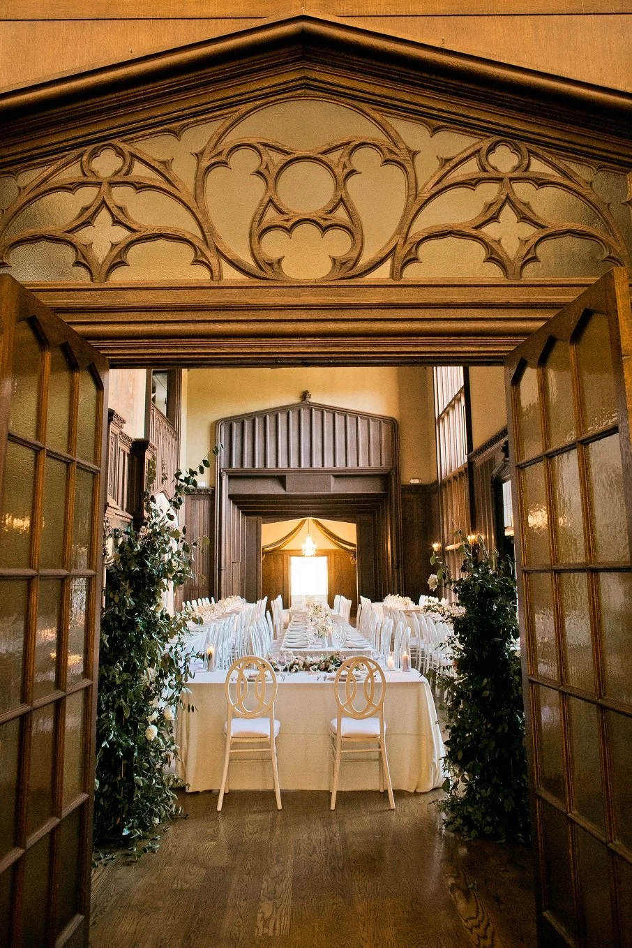 To design their elegant and refined wedding, we leaned into the vibe of the grand mansion venue and focused on elevating all the details. Every detail was thoughtfully considered and chosen. Colors included natural shades of ivory & beige, blush pink, and salmon orange peach. Building out the reception tablescape and layout was a challenging but fun experience. The reception hall was all moody and dark wood. So, to bring more light and visually “brighten and lighten” the space, we picked out neutral colors in the table linens and chairs. We diligently prepared and acquire samples of all the linens and napkins to make sure that the color palette paired well with our floral and candle selections. Delicate-yet-colorful florals were arranged in gorgeous ceramics and the candles were neutral in color. The Bride also worked hard in hand-making beautiful pressed florals for each guest’s placecard. The reception hall gave “Harry Potter Great Hall” vibes so we ran with it by having guests dine “dining hall” style with long banquet tables. Now, this kind of dining experience could potentially limit guest interactions, so we made sure that the layout and centerpieces were conducive to building conversations across more seats than the ones directly next to each guest.