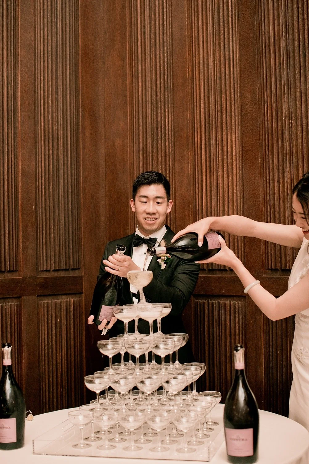 Guests enjoyed an outdoor Ceremony and Cocktail Hour in the most perfect warm weather. We entertained guests with delicious modern Asian cuisine and desserts of Boba and Mochi Donuts to honor the couple’s Chinese heritage! In lieu of a traditional cake-cutting moment, the couple chose to do a champagne tower toast in high-society fashion! And then, guests partied the night away with fun music and dancing.