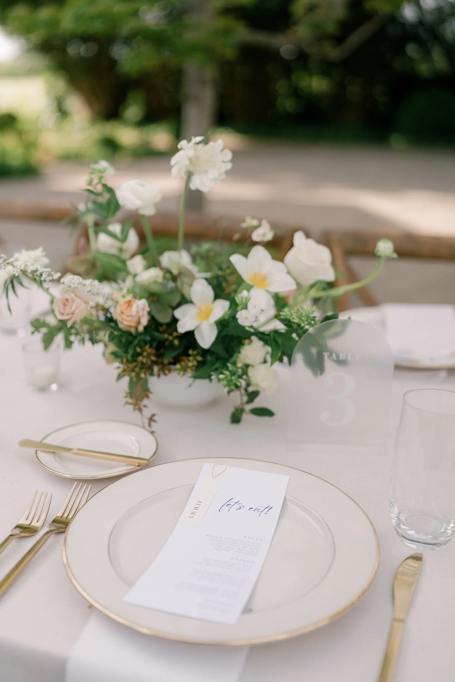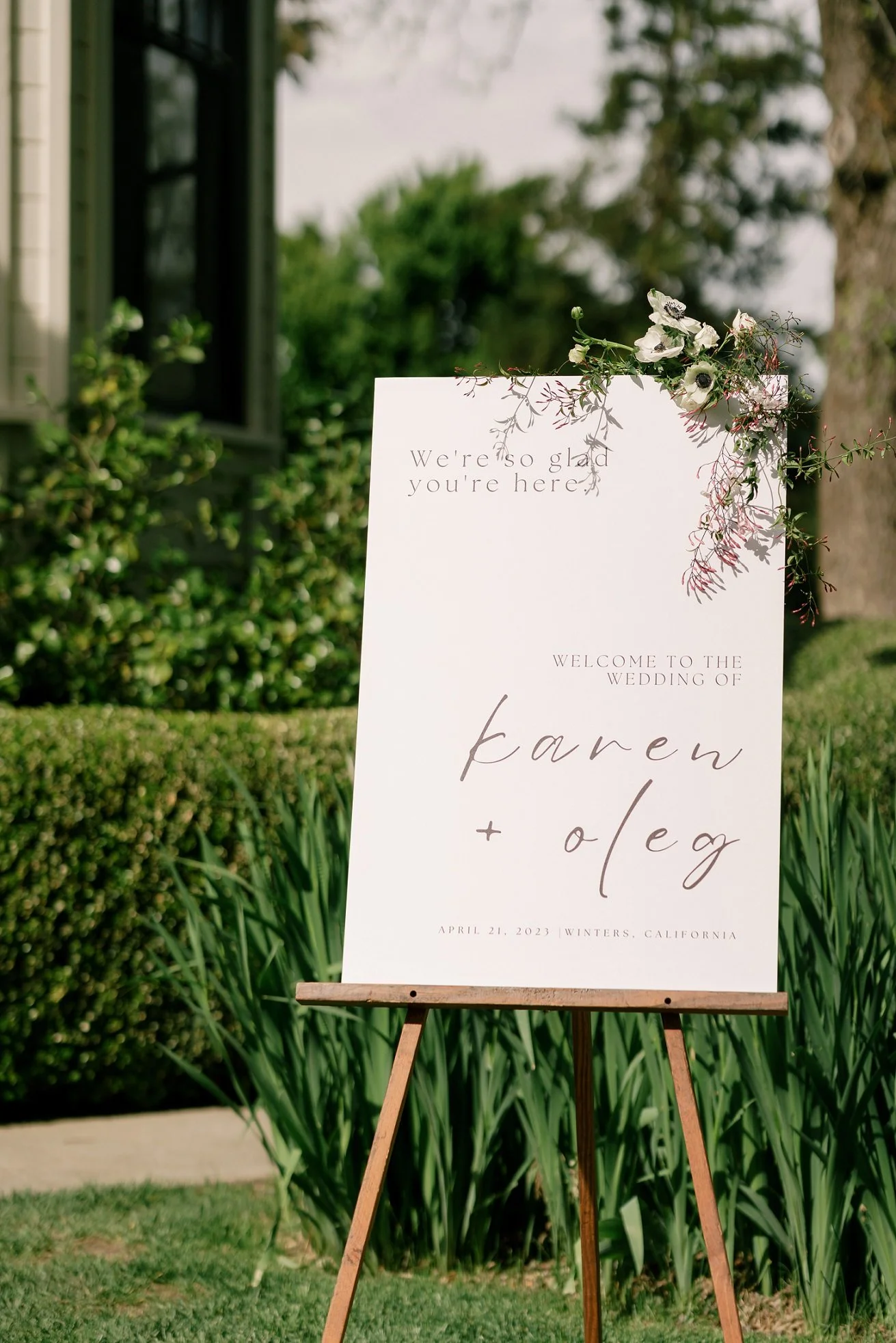 It was such a privilege to design K & O’s wedding. We leaned into the vibe of the estate venue and focused on minimalistic, light, clean, and earthy elements. Colors included natural shades of ivory & beige, mauve, and sage green. Building out the reception tablescape and layout was such a fun experience. We worked hard to acquire samples of all the linens and napkins to make sure that the color palette complemented with our floral and candle selections. The florals were arranged in gorgeous ceramics and the candles were neutral in color while the holders shared gold accents. K & O share an adorable dog in Oatly so we just HAD to subtly incorporate her into the details (namely: the signature drinks and stirrers) and in part of the wedding weekend.